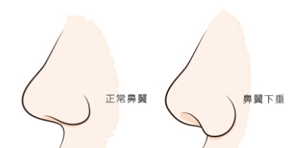 鼻翼下垂鼻翼下垂會使得鼻部看起來略帶朝天,鼻小柱與鼻翼間的比例失衡。矯正的方式除了鼻翼縮減外,如果伴隨有朝天鼻的問題,可以透過隆鼻手術改善。