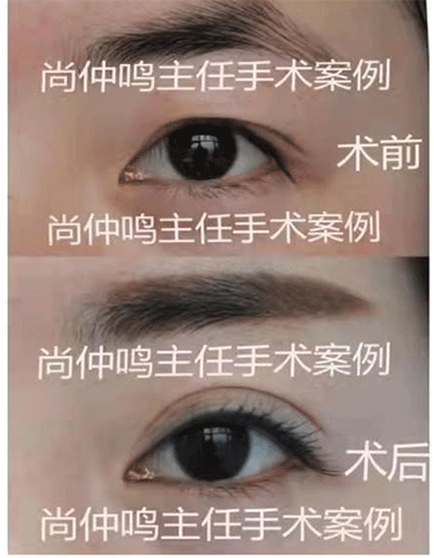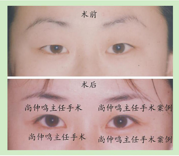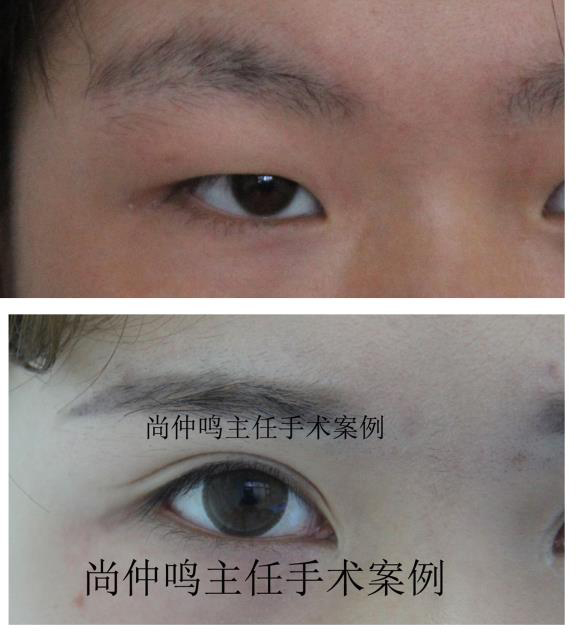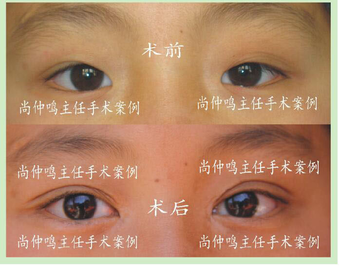 上图是尚仲鸣主任为上睑下垂者做矫正手术的对照资料。上睑下垂是先天性的,矫正手术相对难度大。提示:没参加过高等专业培训的工作者最好不要做。
